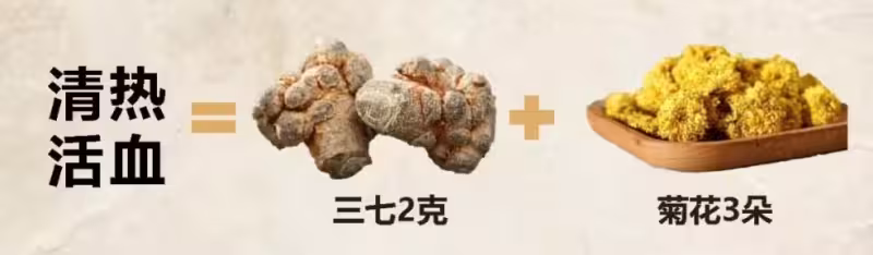 功效:菊花中含有黃酮類化合物和揮髮油,可清熱解毒、抗氧化;三七通過降低血液粘稠度、抑制炎症反應,與菊花共同作用改善高血脂高血壓引發的頭暈眼花。
