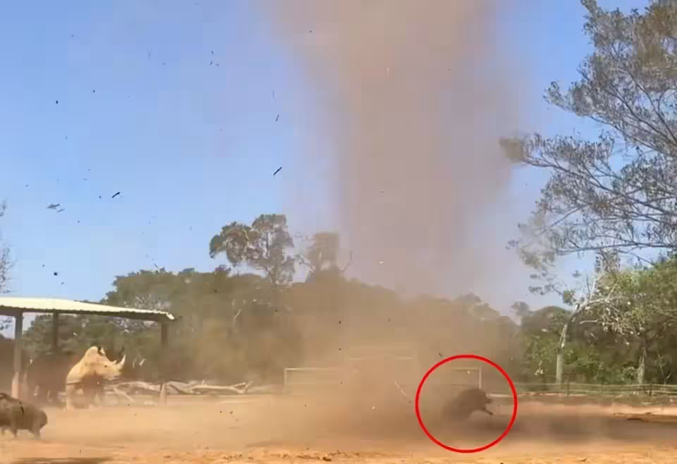 六福村動物園突現「迷你龍捲風」,原本趴在地上的疣豬被捲起來,畫面罕見又爆笑。