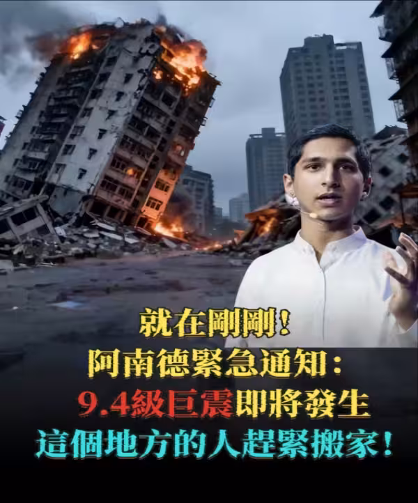 阿南德緊急預言震撼全球:9.4級巨震倒數計時!這地區居民速避難,生死一線間! (最新更新) 就在剛才,國際知名預言家阿南德(Abhigya Anand)透過緊急影片發出全球警示:一場史無前例的9.4級超級強震即將在短期內爆發,震央直指環太平洋地震帶的關鍵敏感區!阿南德顫聲呼籲:「這可能是本世紀最嚴重的自然災難之一,特定地區民眾必須立即撤離,時間已經不多了!」