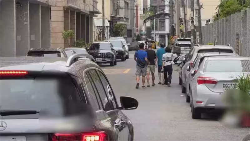 民眾不敢停騎樓,乾脆把車子都移到沒劃設紅線的大門口,導致巷弄兩邊停滿車,行人只能走在正中央。