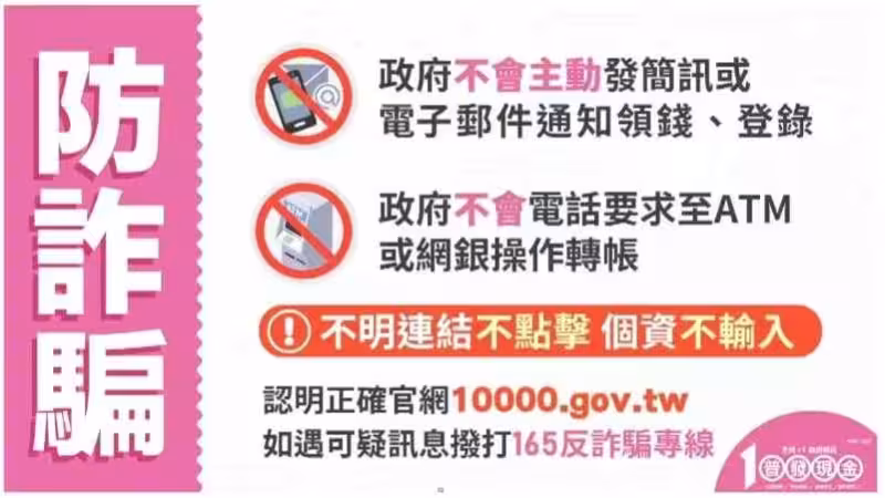 行政院發言人李慧芝提醒,普發現金相關網站不會要求民眾填寫金融卡或隱私資料,也不會要求轉帳,民眾只需要收款或領現。她指出,行政院打擊詐欺指揮中心日前已統籌「打擊詐欺組」,普發現金執行過程如何防詐是重中之重,記者會將詳盡說明。刑事局日前也強調,普發現金相關網站絕對不會要求民眾填寫金融卡或隱私資料,也不會要求轉帳,民眾只需要收款或領現。