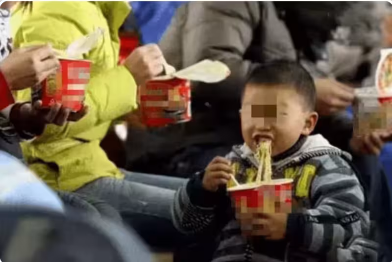 爸爸看孩子餓得直揉肚子,便買了一碗泡麵讓他在座位上吃。