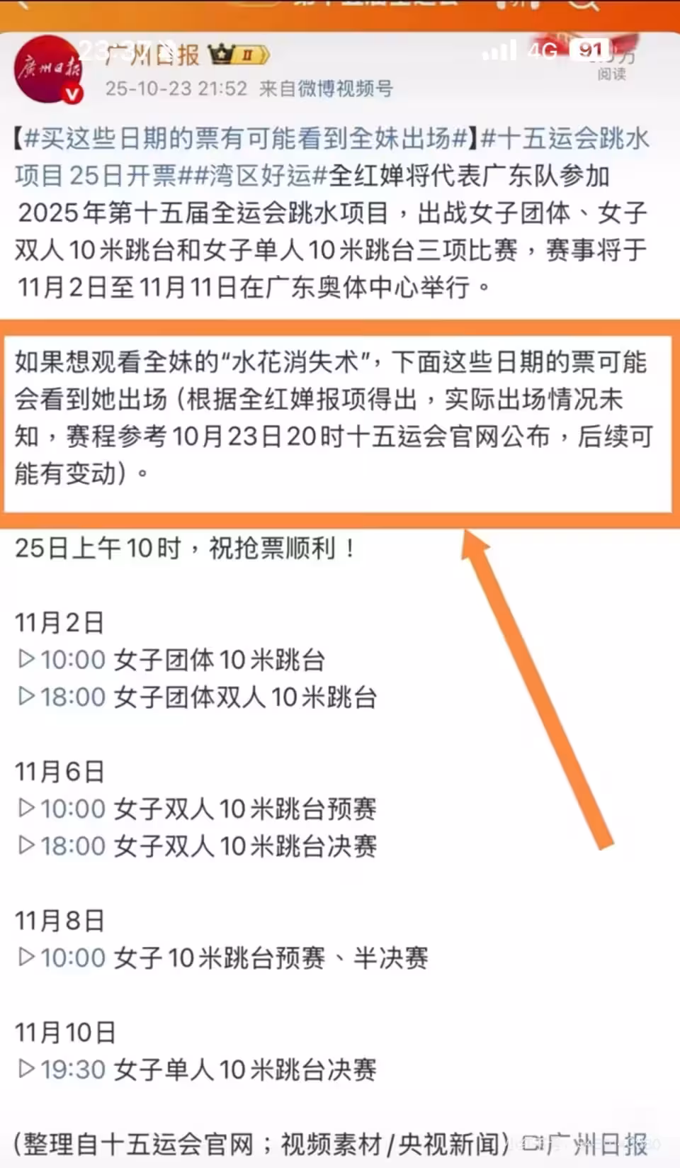 比如《廣州日報》在報道全紅嬋的比賽日期時,就強調「有可能」看到她出場,並沒有用特別肯定的語氣,而且特別說明,這個比賽日期是根據全紅嬋報項得出,實際出場情況為未知,後續可能有變動。