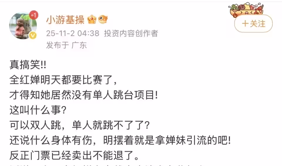 全紅嬋退賽並非臨時決定!網友不滿:官方為何不早說?票賣完了不能退