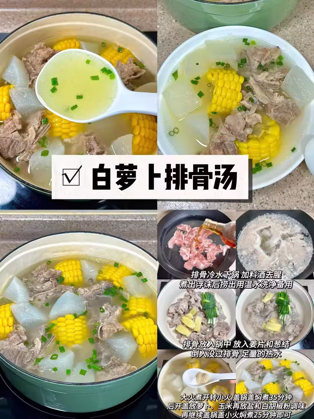 製作步驟: 排骨🍖冷水下鍋 加料酒去腥 煮出浮沫後撈出用溫水洗凈備用 排骨放入鍋中 放入薑片和蔥結 倒入沒過排骨🍖足量的熱水 大火煮開轉小火蓋鍋蓋燜煮35分鐘 後開蓋放蘿蔔、玉米再放鹽和白鬍椒粉調味 再繼續蓋鍋蓋小火燜煮25分鐘即可