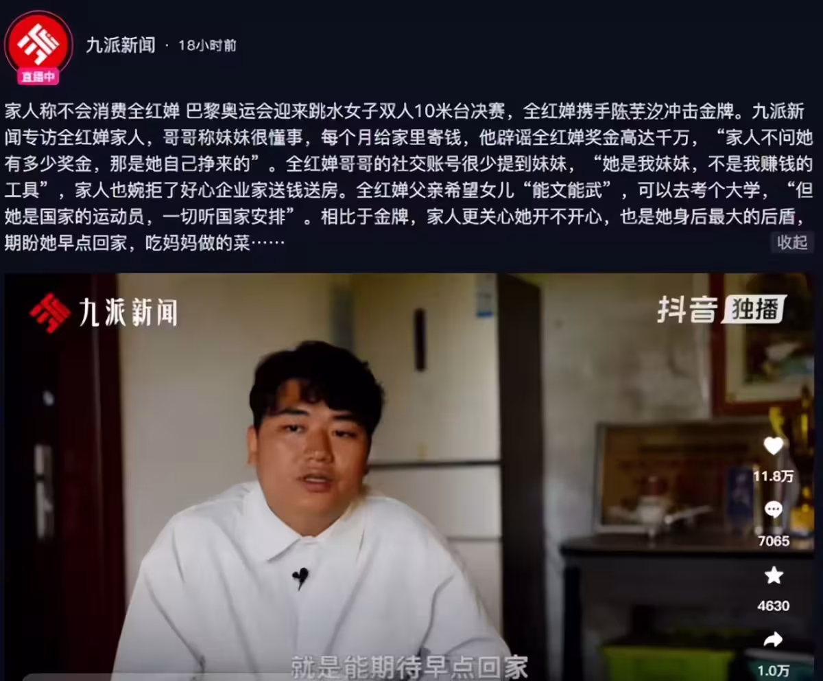 教練說她疼了從不喊,摔了爬起來接著練。獎金到手第一件事:給媽媽轉帳治病。家裡人從不對外說,她卻在一次採訪里自己講了,語氣平淡得像在說「今天食堂飯好吃」。
