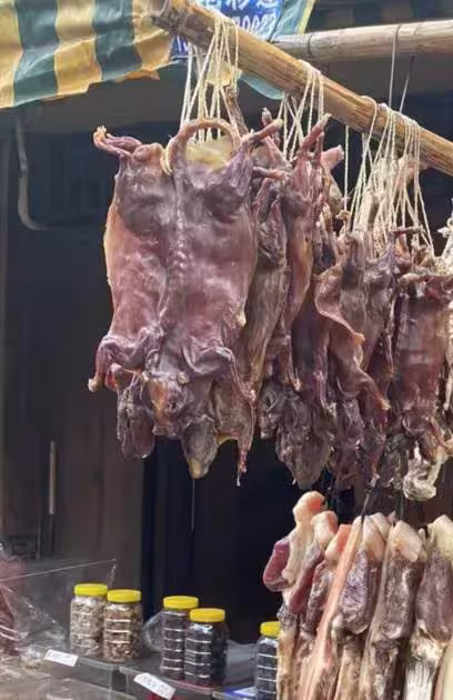 「風乾兔肉,很香很好吃」 「不是老鼠也不是田鼠,這應該叫山鼠個頭很大。