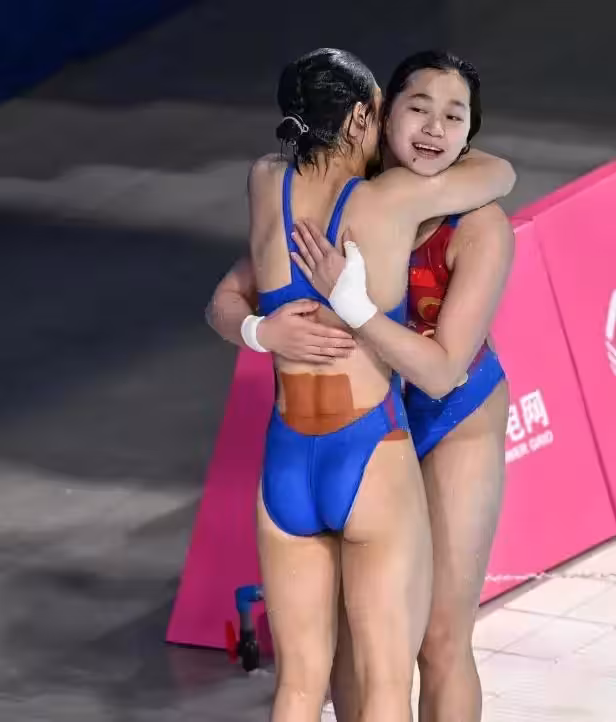 再就是很多黑子毫無根據地質疑裁判偏袒。全紅嬋和王偉瑩的第二跳,因為磨合時間短,在同步性上確實比配合多年的陳芋汐組合稍差一點。