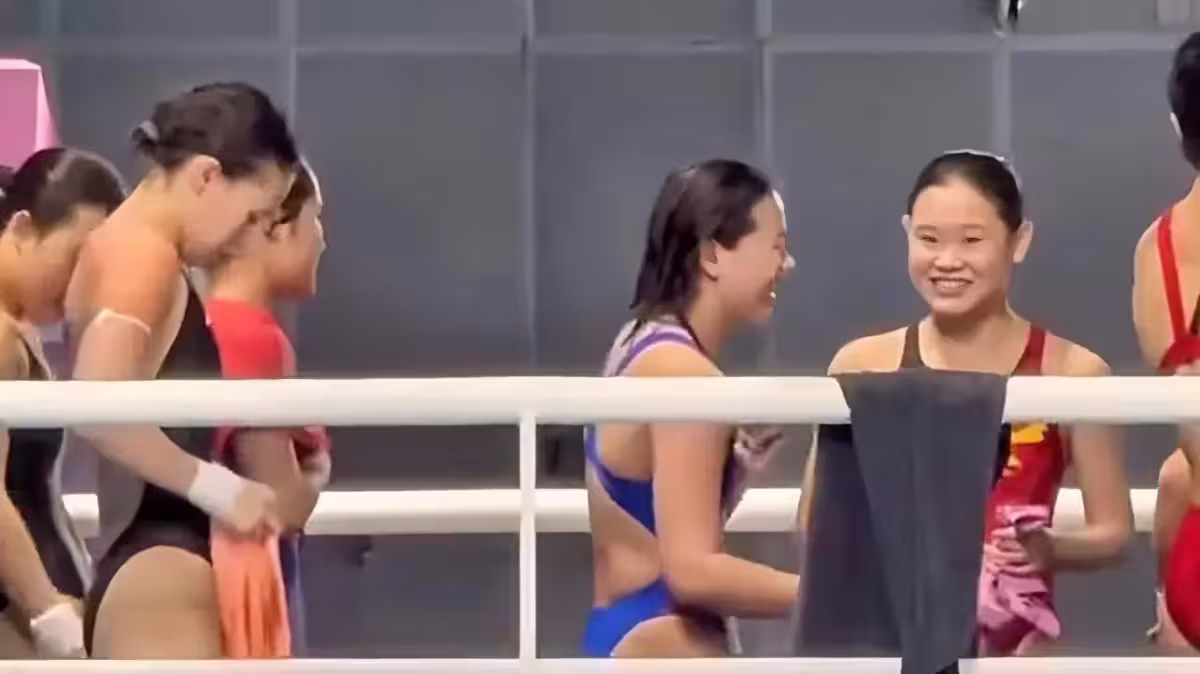 全紅嬋現場娃娃雨下的太大,何威儀教練秒變全紅嬋的娃娃搬運工:秒變小烏龜專業戶