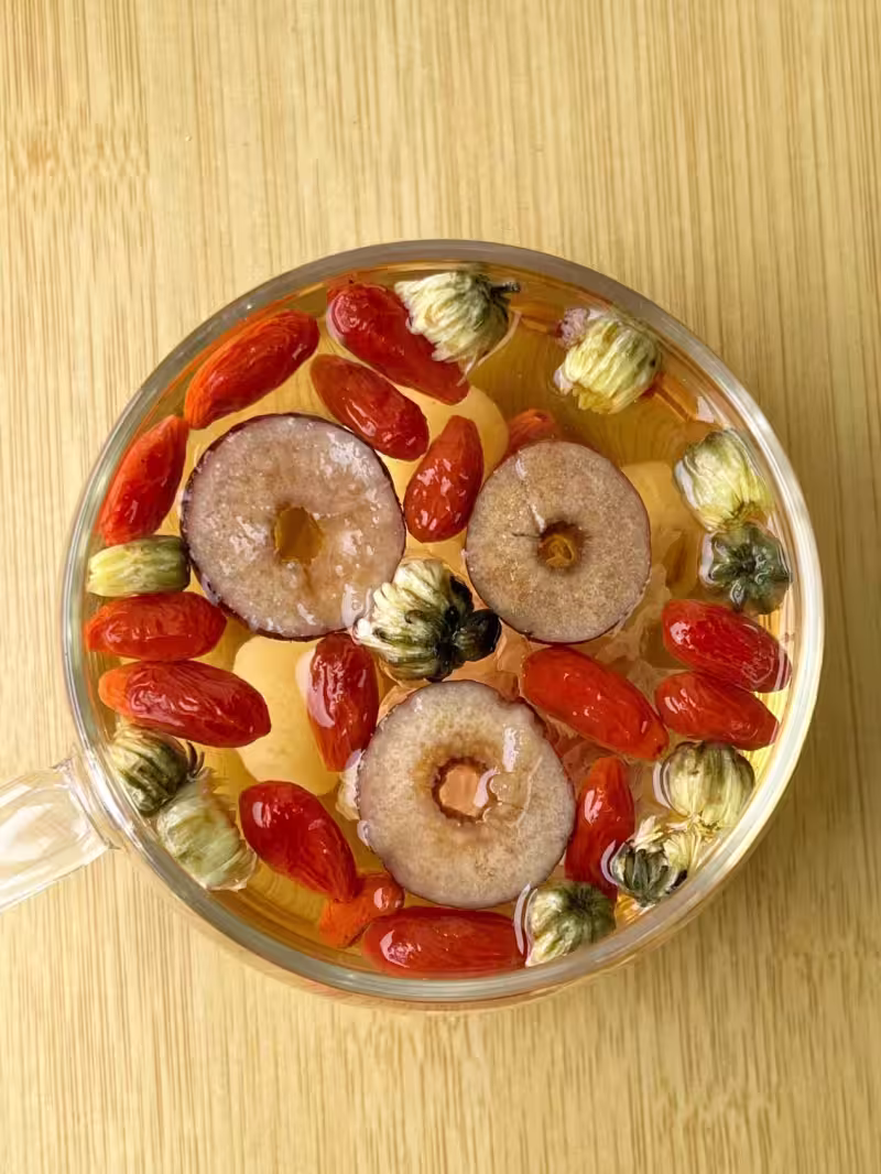 食材:胎菊2g+紅棗3顆+枸杞2g+玫瑰3g+桂圓5g