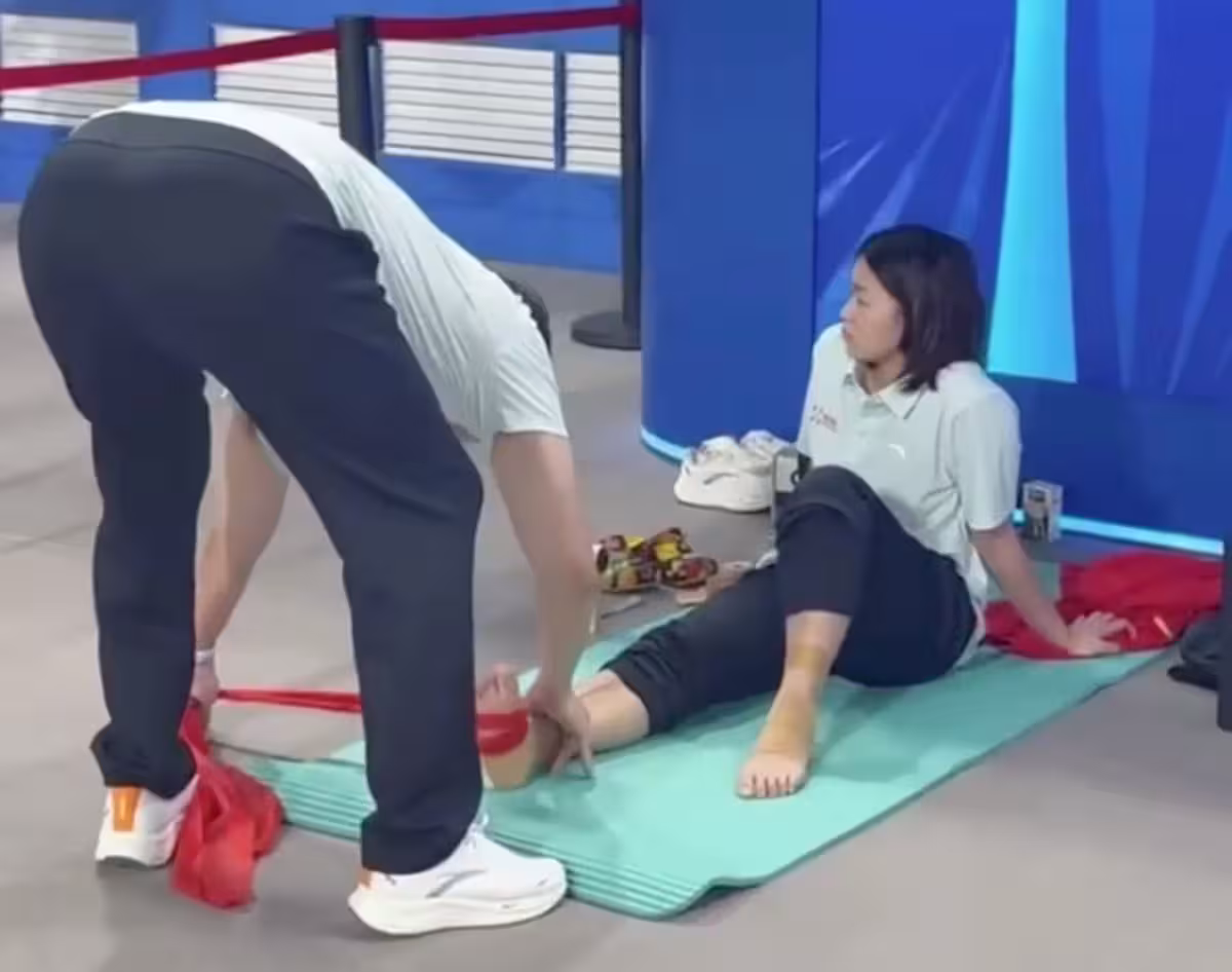 今日,全紅嬋將再次與王偉瑩搭檔衝擊冠軍。昨日,全紅嬋來到游泳館進行賽前的訓練。訓練開始前,她坐在地上,將自己的雙腳貼滿肌貼。很明顯,她的腳傷還沒有痊癒,而這也是全紅嬋放棄單人項目的主要原因。