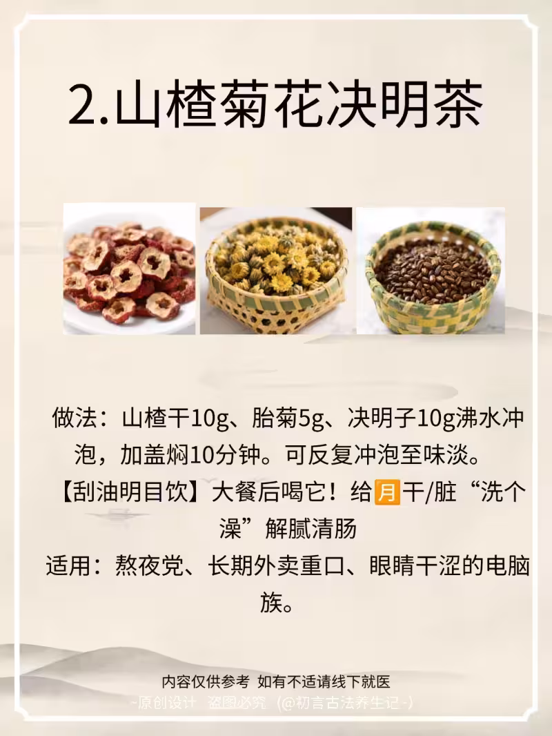 做法:山楂干10g、胎菊5g、玫瑰花5朵,加冰糖少許,開水500ml沖泡5分鐘。