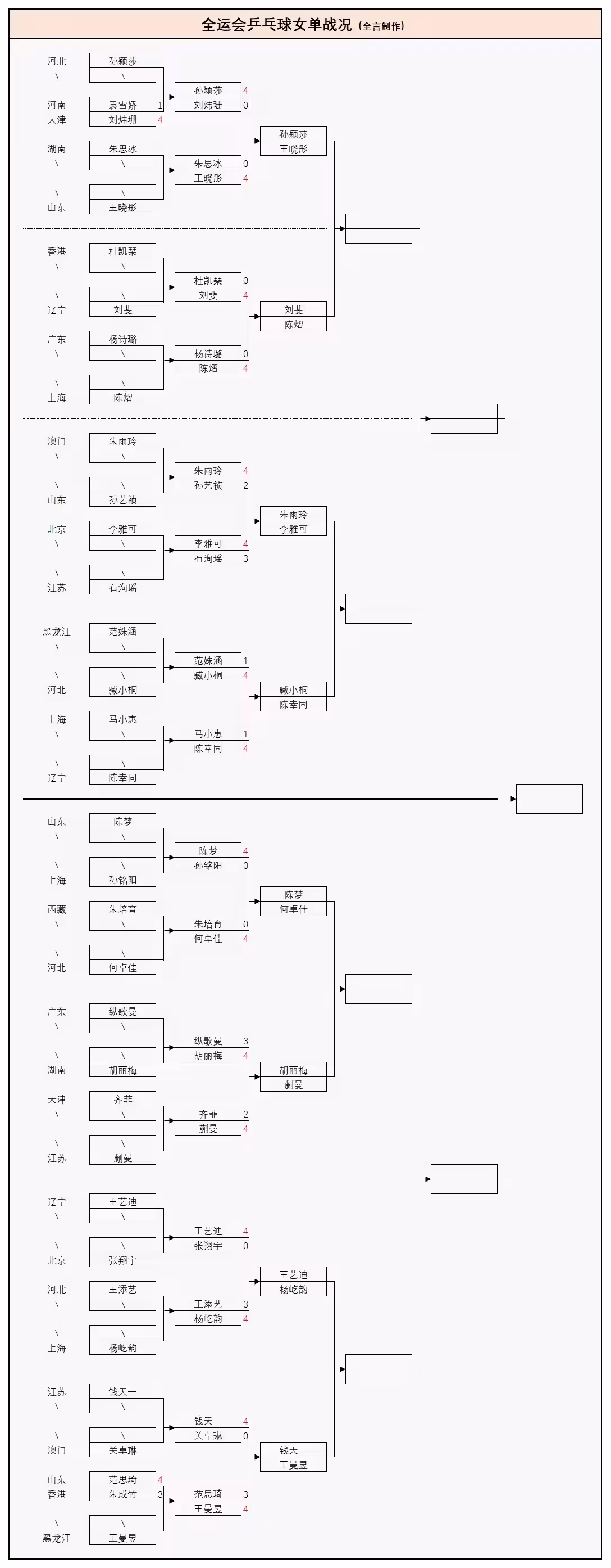 根據安排,全運會桌球成年組選手只會在11月12日參加兩個單打項目的競爭,其中12:30有8場安排,詳情如下: