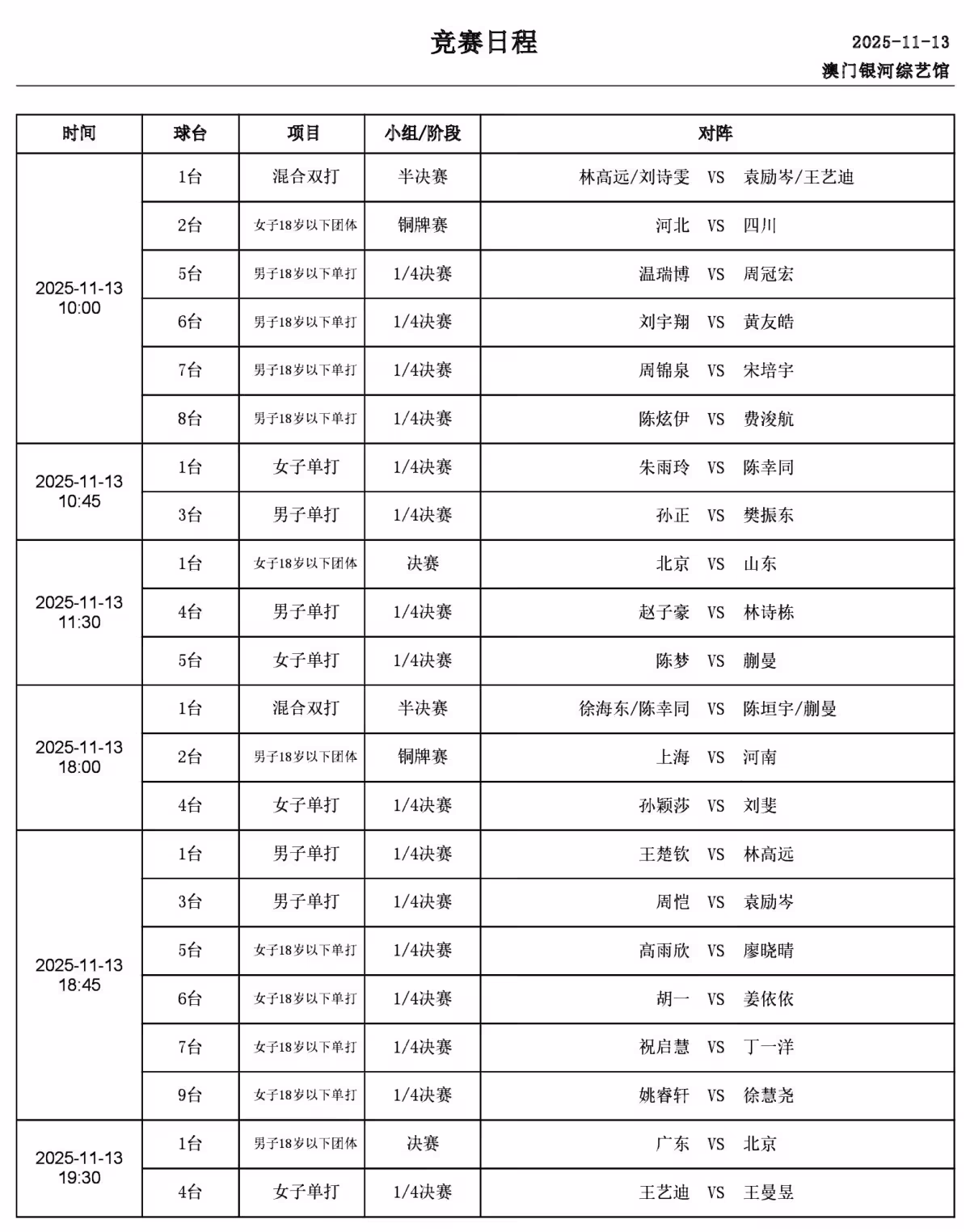 全運會桌球:11月13日賽程公布!12位世界冠軍大混戰,小將衝擊2金