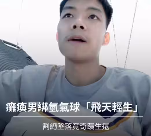 近日,中國廣東惠州發生一起離奇又令人唏噓的事件。一名網名為「頂級對抗路」的年輕男子,疑似因車禍癱瘓、心情低落,綁著氫氣球升空「尋死」,沒想到半空割繩墜落後竟奇蹟生還,引髮網友熱議與官方關注。