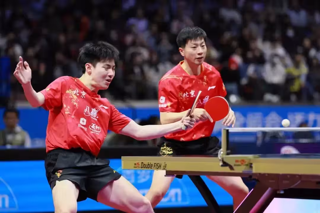 △桌球男團半決賽,北京隊馬龍/黃友政在比賽中。