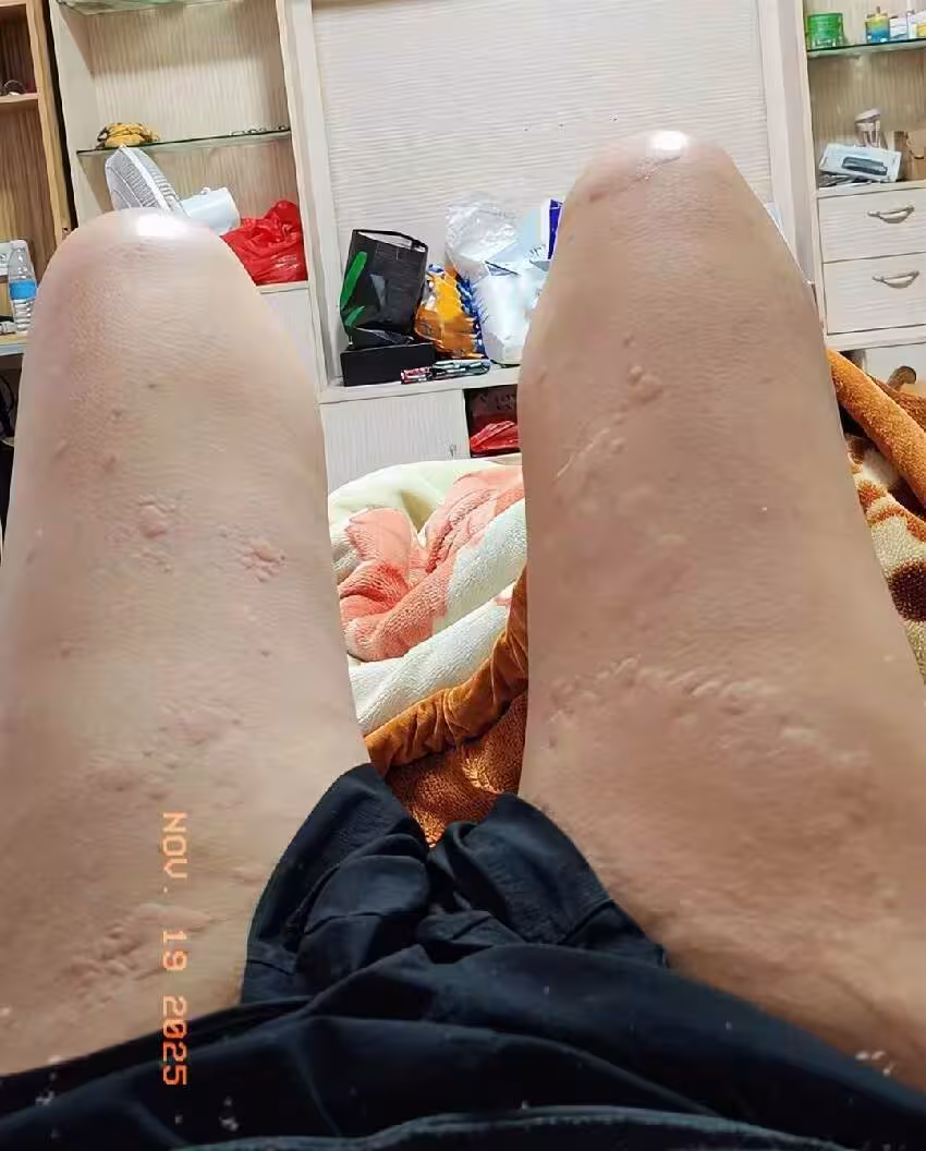 推文人用「大半夜醒來我直接懵了」描述驚魂一刻:雙腿雙腳突然冒出密集疙瘩,瘙癢難忍到「抓一下就腫一片」,嚴重到早上無法穿鞋。