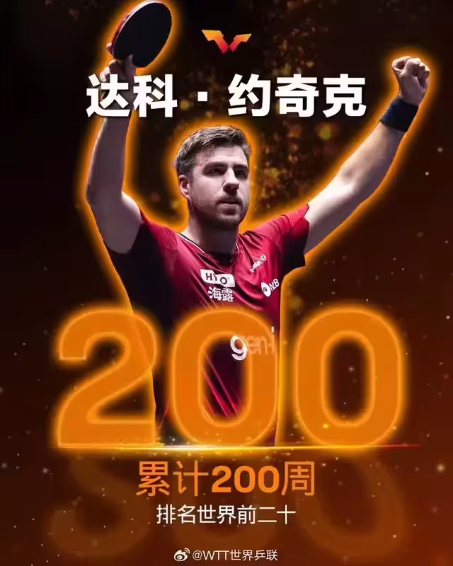 斯洛維尼亞名將達科·約爾吉奇成為另一位紀錄創造者,他的男單世界前二十累計周數突破200周。作為國際賽場最具實力的歐洲選手之一,目前世界排名第14位的約爾吉奇本賽季展現出不俗的競技狀態:先後闖入WTT斯科普里挑戰賽和WTT盧布爾雅那球星挑戰賽四強。此外,他還在WTT美國大滿貫、WTT歐洲大滿貫躋身八強,並在WTT阿拉木圖挑戰賽、WTT蒙彼利埃冠軍賽、WTT馬斯喀特球星挑戰賽同樣闖入四分之一決賽階段。