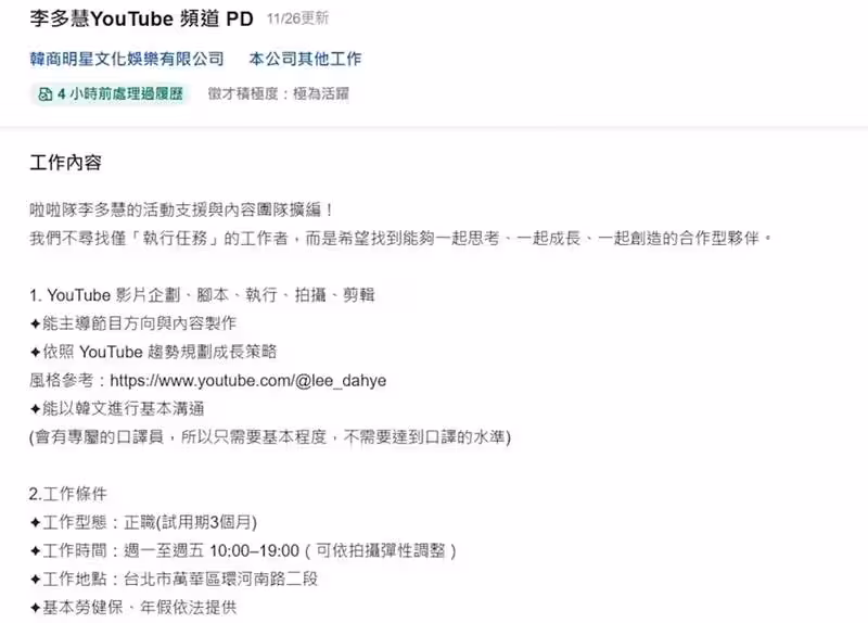 李多慧團隊在人力銀行徵才,職務為經紀助理和頻道執行企劃,月薪為4萬以上,工作內容為YouTube影片企劃、腳本、執行、拍攝及剪輯等,應徵者需要具備主導節目方向與製作的能力,還要能掌握流量趨勢,規劃頻道未來走向,雖然團隊有口譯人員,還是希望應徵者具備基礎韓文能力,如果會開車,則是加分條件,其他內容包括試用期三個月、工作時間為周一至周五,早上十點到晚上七點,工作地點則在台北萬華一帶,提供基本勞健保和年假制度。