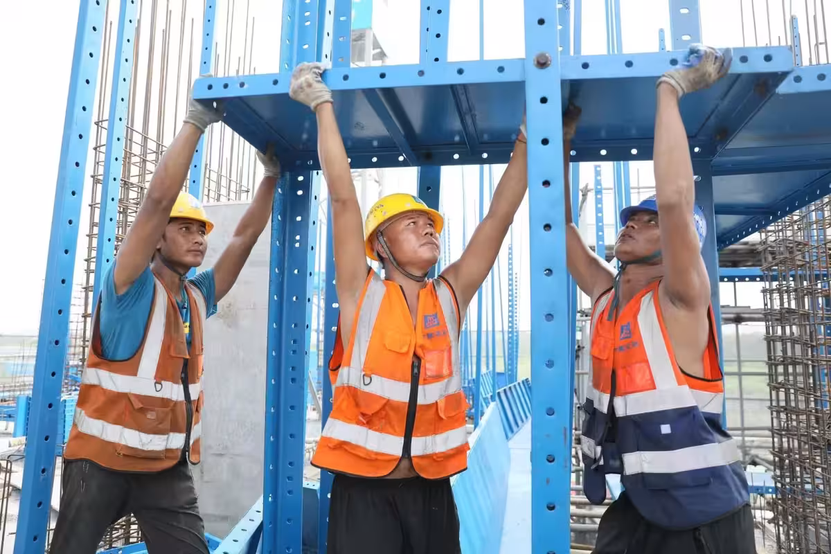 ▲2025年7月15日,廣州,3名爬架工安裝爬架。圖據視覺中國