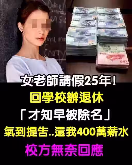 女老師請假25年!回學校辦退休「才知早被除名」氣到提告「還我400萬薪水」校方無奈回應