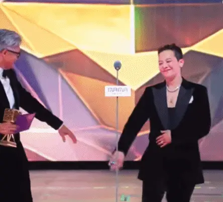但之後為權志龍頒獎時,嚴肅的他就像換了一個人一樣。