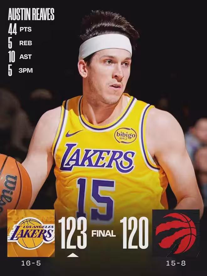 12月5日,依靠著八村塁的三分絕殺,湖人123-120險勝猛龍。湖人後衛里夫斯21投13中,三分11中5,罰球15中13,得到44分5籃板10助攻,正負值+6並列全場最高。本賽季至今,里夫斯場均轟下28.9分,高居聯盟第六。