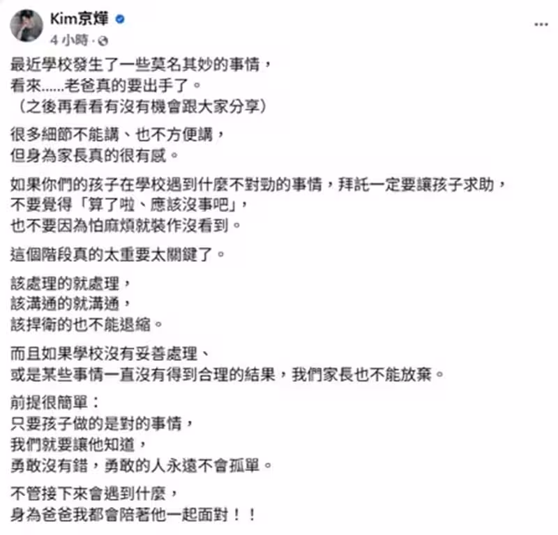 最後,Kim以一句話展現身為父親的堅定:「不管接下來會遇到什麼,身為爸爸我都會陪著他一起面對!!」此次發文雖未揭露事件細節,但已成功引發社群對校園議題的關注,貼文曝光後,許多網友湧入留言力挺留言:「希望事情圓滿處理,一切往好的發展」、「沒錯!為了孩子一定要適時地挺身而出!加油!祝順利!」、「同捍衛家人絕不寬待!」