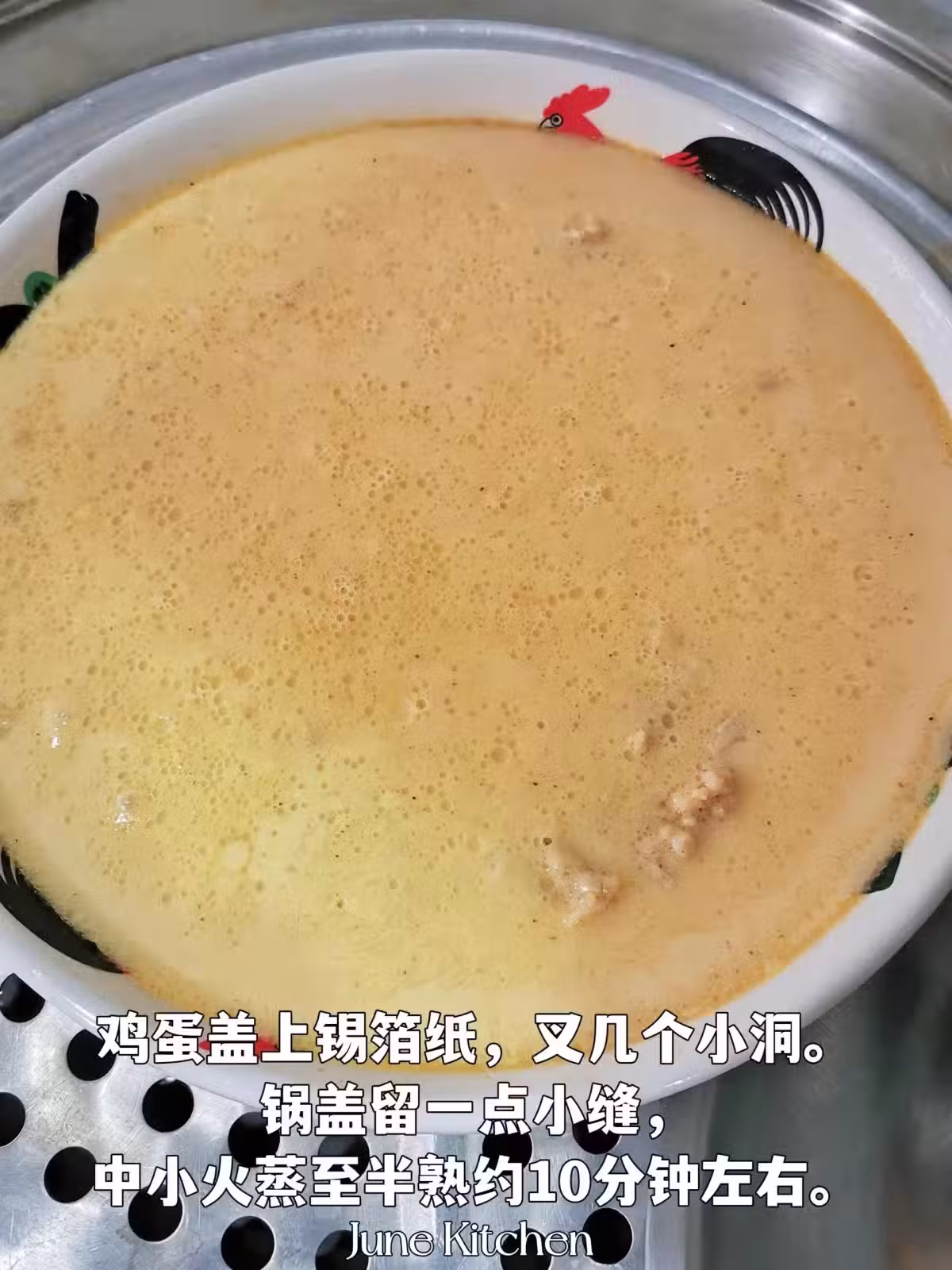 5️⃣越蛋液表面還未完全固定,加入皮蛋和鹹蛋黃。蓋上鍋蓋繼續蒸5分鐘,熄火燜10分鐘即可。