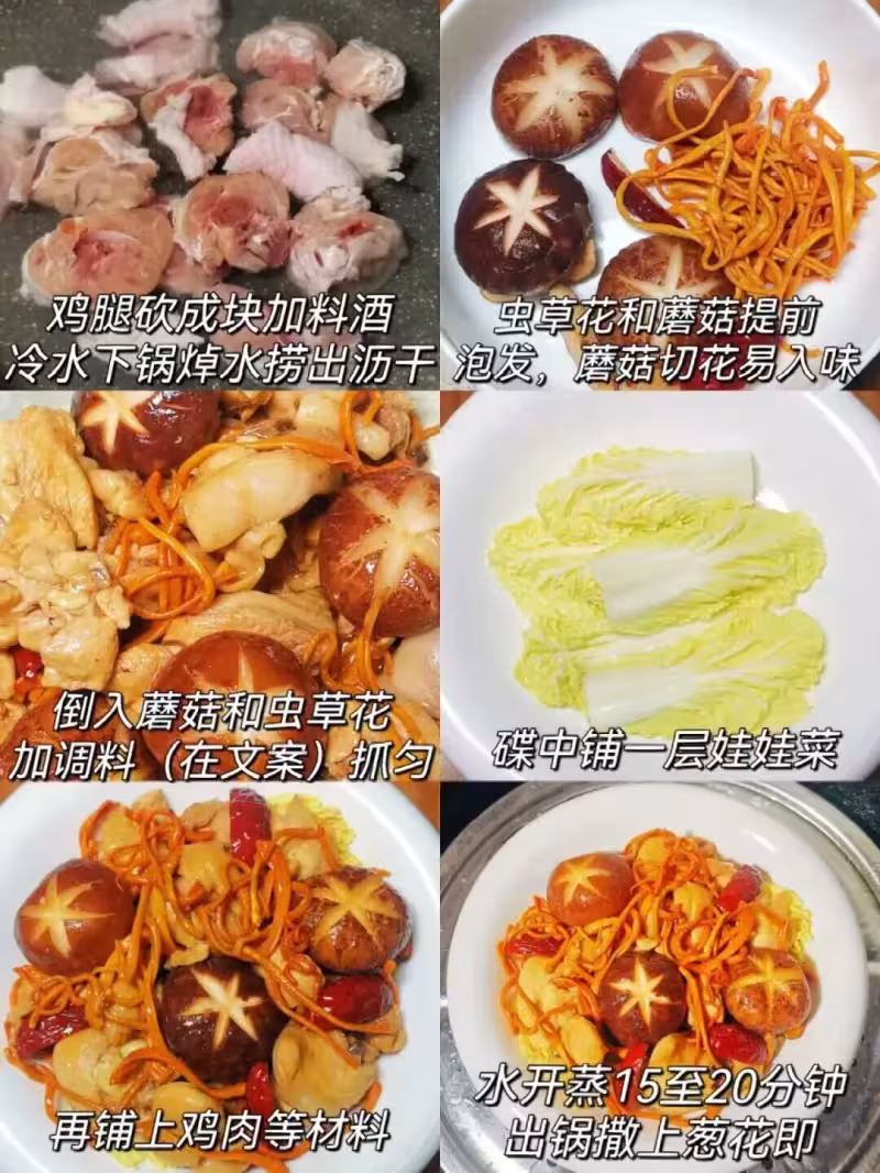雞腿2個、蟲草花1小把、干香菇5朵、娃娃菜半顆、紅棗4顆