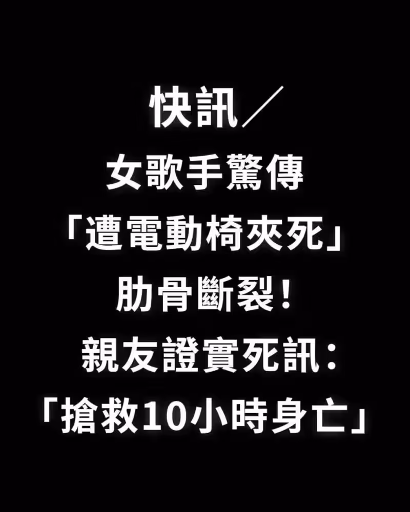 快訊/ 女歌手驚傳「遭電動椅夾死」肋骨斷裂!!! 親友證實死訊:「搶救10小時身亡」!