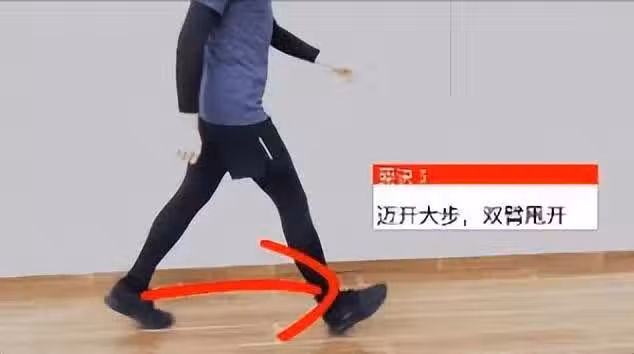 ③走路時,一邊邁開大步,一邊甩開雙臂。