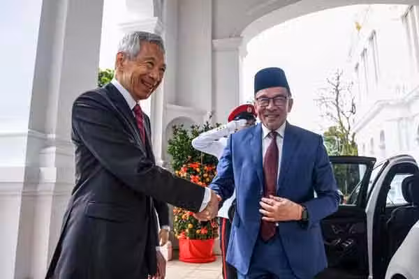安華(右)抵達新加坡總統府時,獲李顯龍親自迎接。