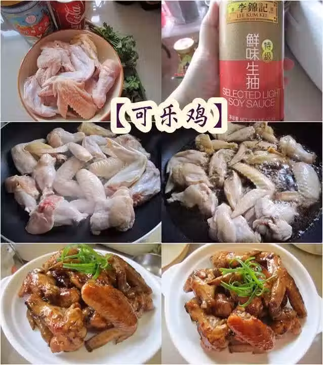 2) 放入雞翅兩面煎一下,加入可樂和醬油和薑和蔥和料酒,蓋上鍋蓋