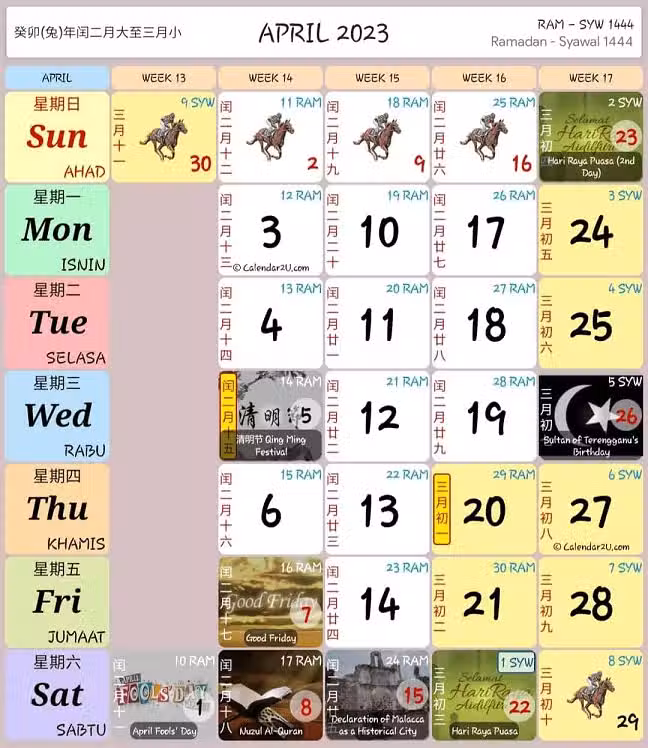 23 Apr : Jumaat :Hari raya aidilfitri (Raya Puasa) * Hari Kedua : Semua Negeri