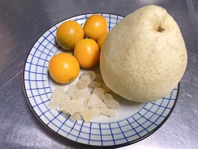 1:金桔和雪梨用鹽搓洗,再用清水沖洗乾淨;