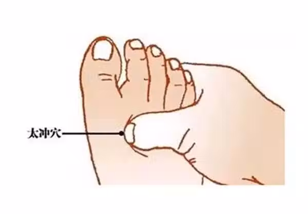 這是指太沖穴,位置在足背第一、二蹠骨結合部之前的凹陷中。用拇指按揉3~5分鐘,感覺輕微酸脹即可。不要用太大的力氣,兩隻腳交替按壓。