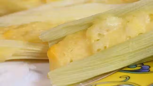 做法:①玉米剝去外皮,外皮改刀備用。取下玉米粒,一部分打碎成玉米漿。②玉米漿和玉米粒以2:1的比例混合,再加200克麵粉、20克泡打粉、100克酸奶,最後加入蘋果粒、攪拌均勻。③將麵漿放到玉米皮上,上鍋蒸製20分鐘即可。