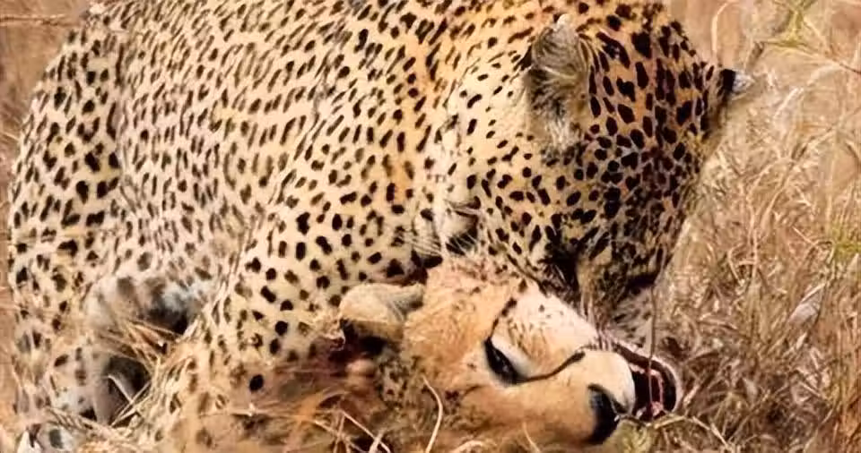花豹殺死了一隻獵豹。獵豹為了速度,丟掉了力量與利爪。獵豹一旦受傷,很容易淪為獅子、花豹、鬣狗等的盤中餐。