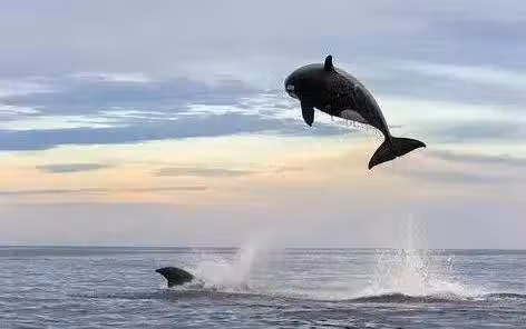 虎鯨高高躍起,只為追殺海豚。虎鯨、海豚同屬海豚科。本是同根生,相煎何太急。
