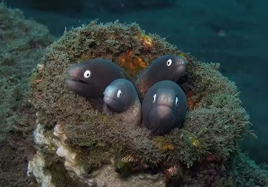 海鱔躲在海底的樣子,一雙雙蠢萌的大眼睛,看上去又呆又萌。千萬別被這種外表欺騙了,它們可是殘酷的海底殺手!