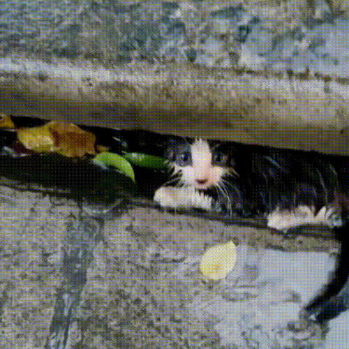 可能是被雨水淋傻了,亦或是跑步跑累了,毛孩子一臉懵逼地縮在下水道口,瑟瑟發抖地望著小姐姐,趁喵星人不注意,小姐姐迅速提起它的後脖頸,一把把小貓抱進了懷裡,一場持久的拉鋸戰終於結束了。
