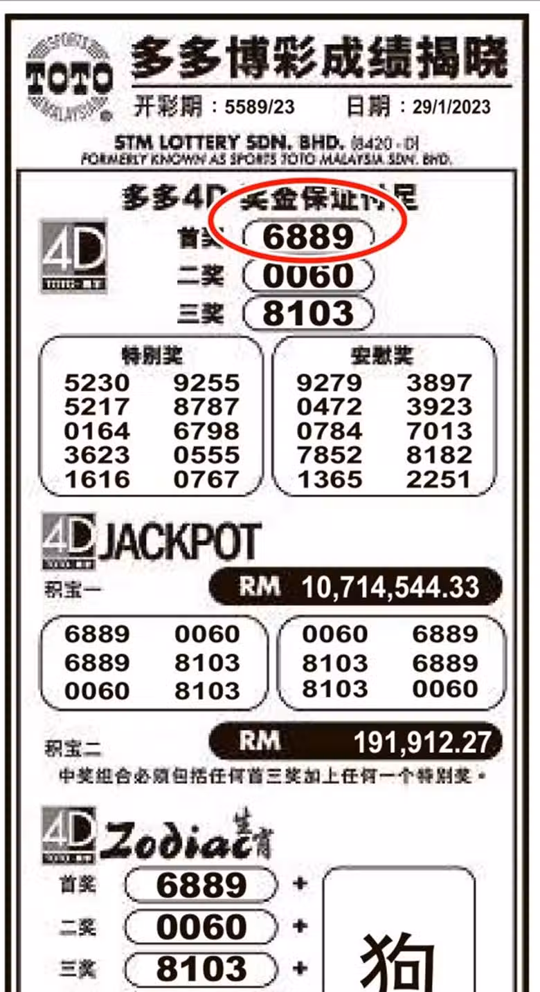 6889於1月29日在多多博彩開出首獎