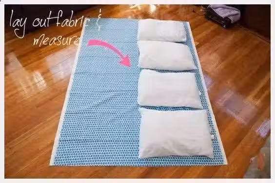 所需材料:將清洗並消好毒的枕頭準備4個(48*74左右的尺寸),一塊大布(給孩子用最好是用全棉的布料,舒適度會更高)大小要比放下四個枕頭還要大點、針線。