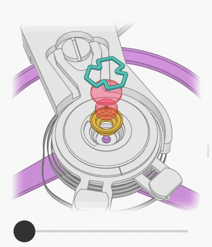 當手錶突然抖動時,這種機制可以保護擺輪軸的脆弱尖端不被折斷。讓我們看看當擺輪軸晃動時這些部件如何協同工作:
