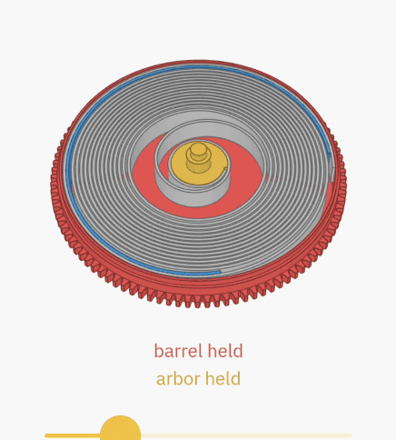 請看,一旦我們釋放滑塊鬆開心軸,主發條就會將心軸向右轉回到放鬆狀態。這並不理想——我們希望保持心軸固定,改為發條盒轉動,以便它可以從主發條中獲得動能,為手錶的其他部分提供動力。
