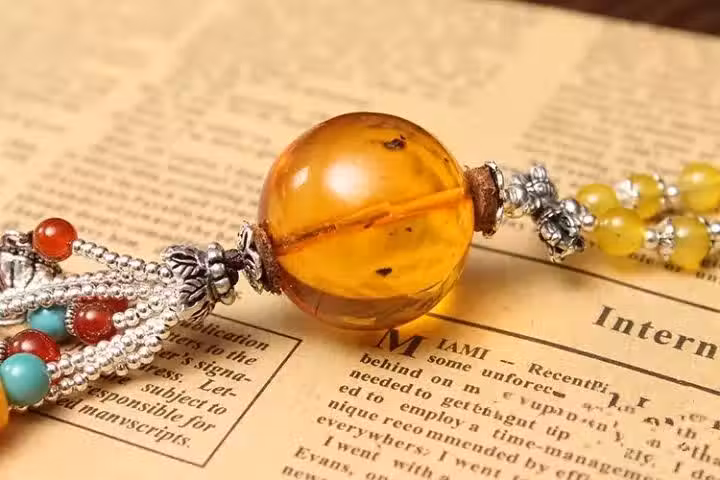 4、琥珀中常常有包裹物,如昆蟲、種籽和其他外來物,都是松脂硬化以前捕獲的。德國人把琥珀稱為燃燒石,因為它在極低溫度 下燃燒。