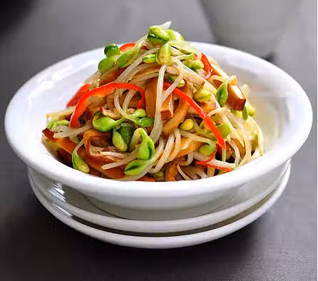 黃豆芽去根,洗凈瀝干水份。香乾切成長條,紅椒去籽切成細條。
