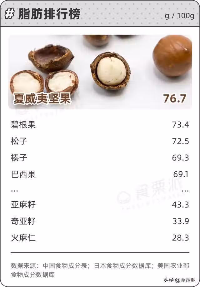 俗話說:「一口堅果半口油」,夏威夷堅果、碧根果、松子、榛子的油脂含量達到70%,3/4都是油了。這5種堅果也是熱量最高的。