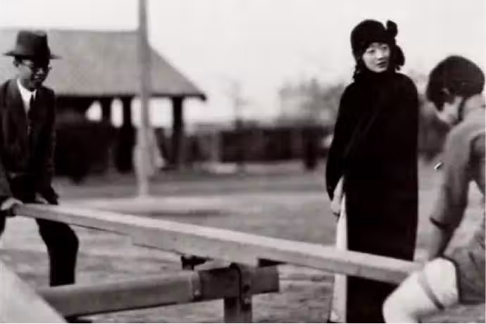 溥儀和妹妹玩蹺蹺板,婉容站在旁邊觀看。